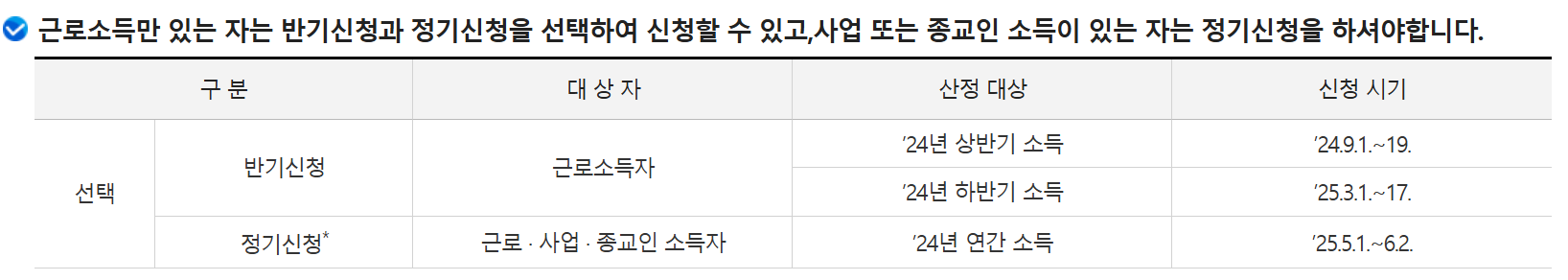 근로장려금은 반기신청과 정기신청으로 나뉘며, 신청 기간과 지급 일정은 다음과 같습니다.