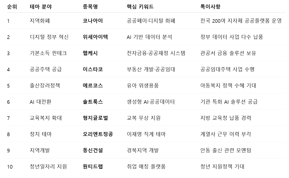 📊 주요 정책 수혜주 TOP 10 (표 정리)