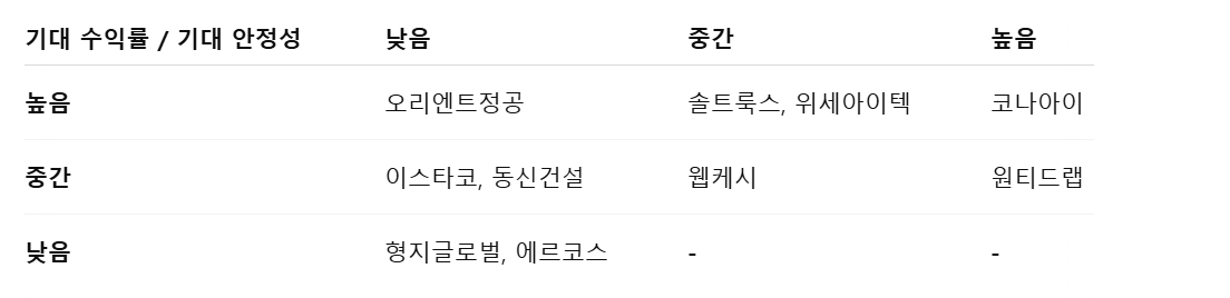 🔎 오른쪽으로 갈수록 안정성 ↑, 위로 갈수록 기대 수익률 ↑